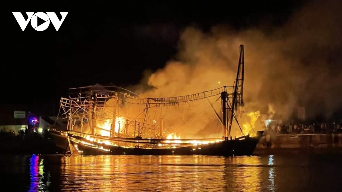 VOV.VN - Đêm qua, tại cảng Nam, huyện Quỳnh Lưu, tỉnh Nghệ An, xảy ra vụ hỏa hoạn, thiêu rụi 5 tàu cá của ngư dân. Ước tính thiệt hại khoảng 15 tỉ đồng.