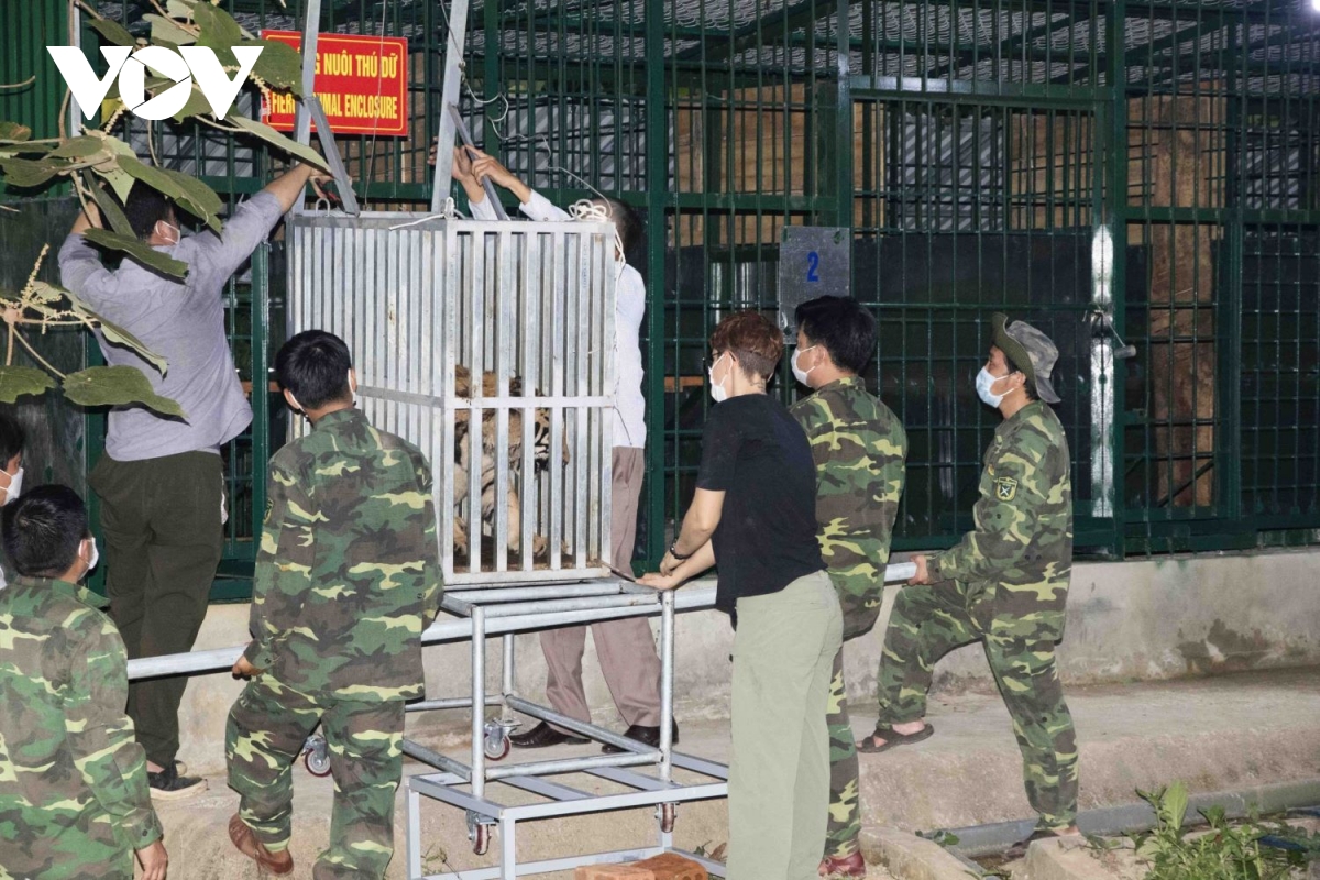 Để vận chuyển các cá thể này vào khu chăm sóc mới tại tỉnh Quảng Bình, cơ quan chức năng đã cho 7 con hổ vào các lồng sắt mà không bắn thuốc mê, hạn chế cho hổ ăn no trước khi di chuyển. Trước đó, nhân viên chăm sóc đã tập cho hổ làm quen với lồng vận chuyển bằng phương pháp cho ăn trong lồng nhỏ tại chuồng nuôi. Lồng dài 1,2m, được tính toán phù hợp để có thể đưa vào chuồng nuôi dễ dàng.