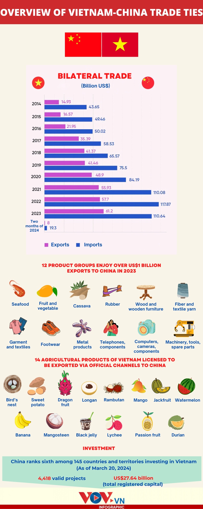 VOV.VN - China has long been Vietnam’s top trading partner, with bilateral trade soaring to approximately US$172 billion by 2023, while the Vietnamese side claims the title of being China's largest trading partner within ASEAN and fifth in the world overall.