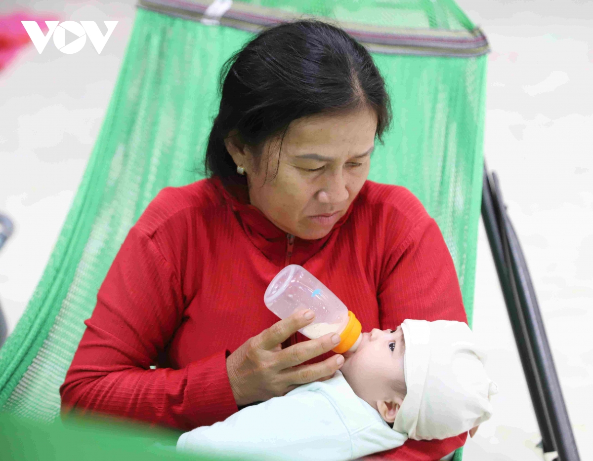 Người phụ nữ bón sữa cho cháu ngoại tại điểm trú bão Đảng uỷ phường Xuân Đài, tỉnh Đắk Lắk