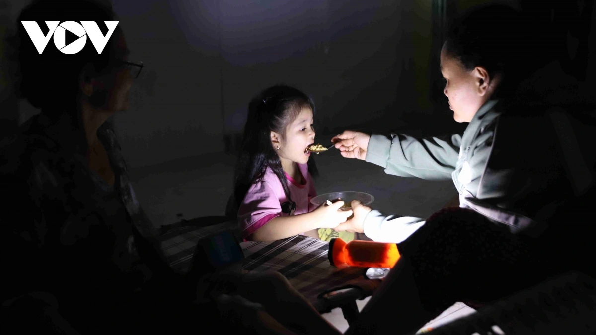 Một người mẹ ở phường Xuân Đài, tỉnh Đắk Lắk cho con gái nhỏ ăn. Do mất điện, nên hai mẹ con sử dụng đèn pin để thắp sáng
