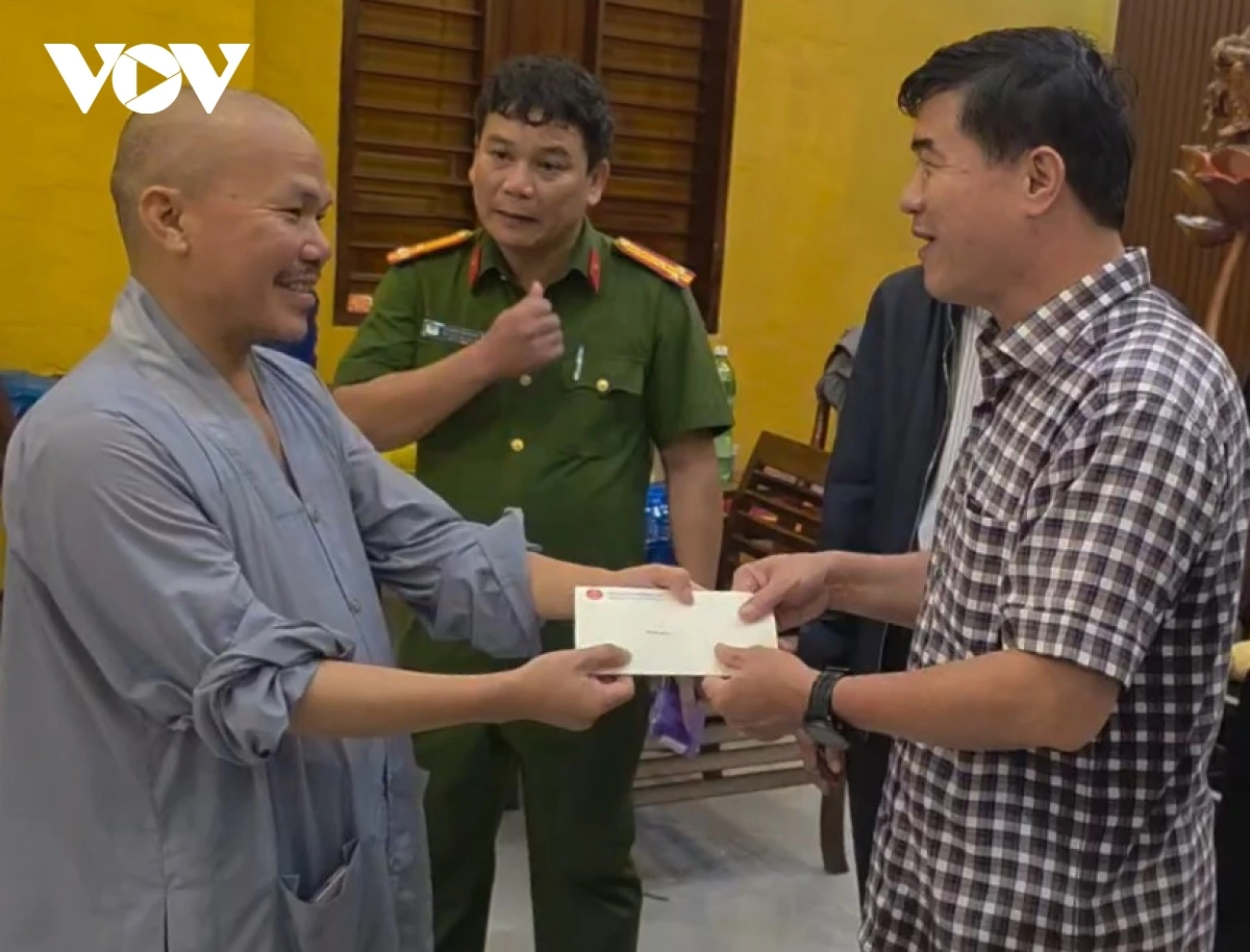 Ông Nguyễn Thiên Văn, Phó Chủ tịch UBND tỉnh Đắk Lắk (áo ca rô) trao quà cho người dân ở xã Tuy An Nam, khi đang tránh trú bão số 13