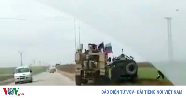 VOVVN - VOV.VN - Chiếc xe quân sự Mỹ đã tạt đầu xe thiết giáp Nga trên một con đường ở Syria sau khi chiếc xe thiết giáp của Nga cố vượt đoàn xe của Mỹ.