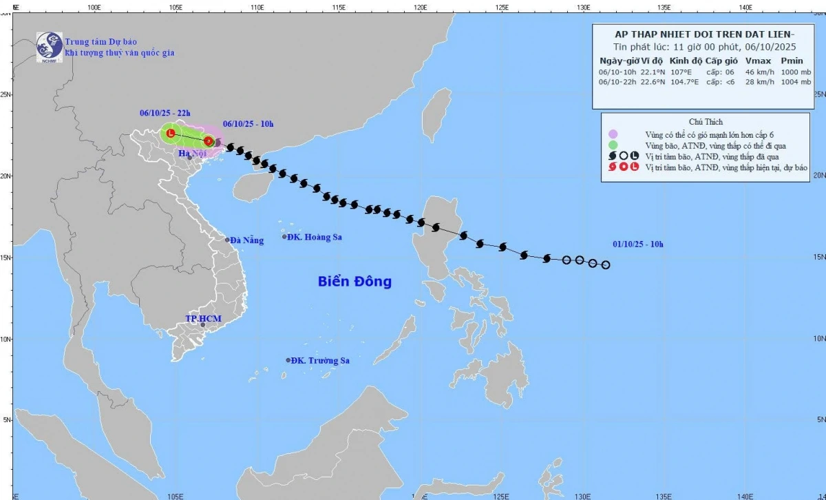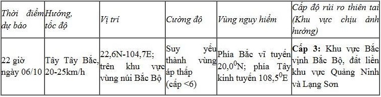 Hồi 10h sáng nay (6/10), vị trí tâm áp thấp nhiệt đới ở vào khoảng 22,1 độ Vĩ Bắc; 107,0 độ Kinh Đông, trên khu vực phía Nam tỉnh Quảng Tây (Trung Quốc). Sức gió mạnh nhất vùng gần tâm áp thấp nhiệt đới mạnh cấp 6 (39-49km/giờ), giật cấp 8. Di chuyển theo hướng Tây, tốc độ khoảng 15km/h.