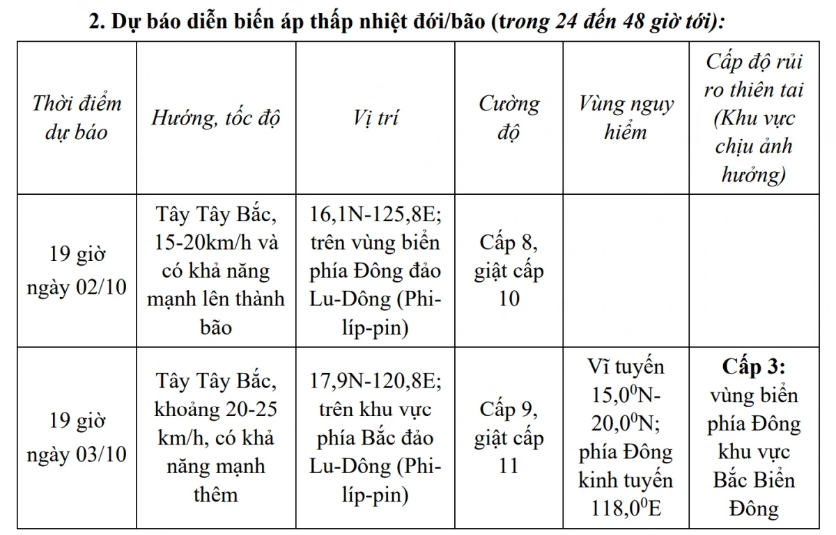 19h ngày 02/10: Vị trí tâm áp thấp nhiệt đới ở khoảng 16,1°N-125,8°E, trên vùng biển phía Đông đảo Lu-Dông. Sức gió mạnh cấp 8, giật cấp 10, di chuyển theo hướng Tây Tây Bắc với vận tốc 15-20km/h và có khả năng mạnh lên thành bão.
