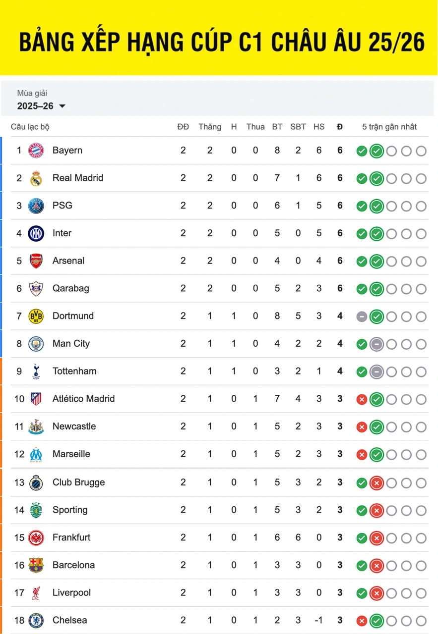 Bảng xếp hạng Cúp C1 châu Âu mới nhất được người hâm mộ chú ý khi đương kim vô địch PSG có chiến thắng thứ hai liên tiếp để áp sát vị trí đầu bảng. Ngoài ra, hai đại diện của bóng đá Anh là Arsenal và Man City cũng góp mặt trong top 8 nhờ vào kết quả tốt ở lượt trận thứ hai.