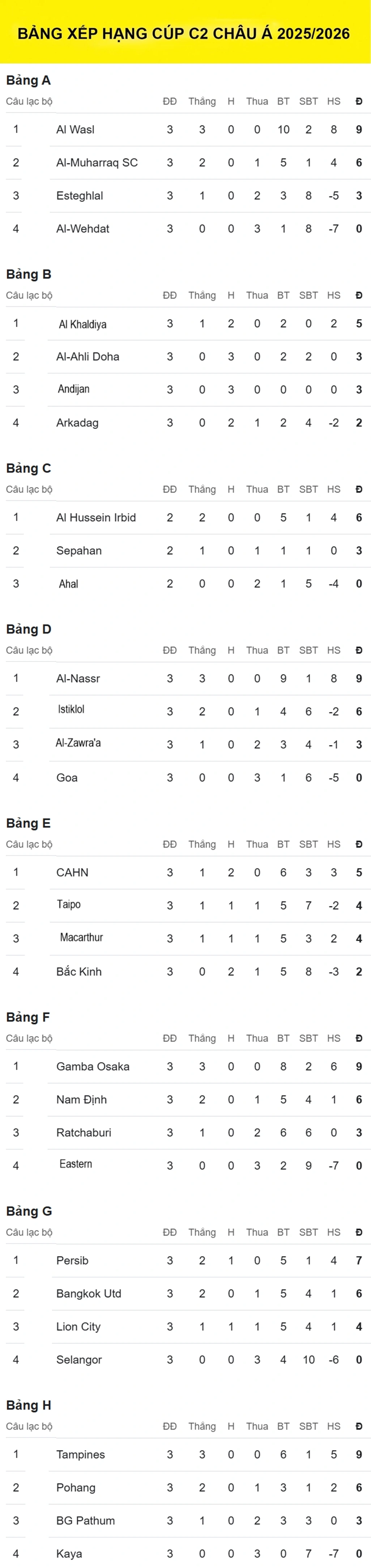 Bảng xếp hạng Cúp C2 châu Á mới nhất: CLB CAHN duy trì ngôi đầu bảng
