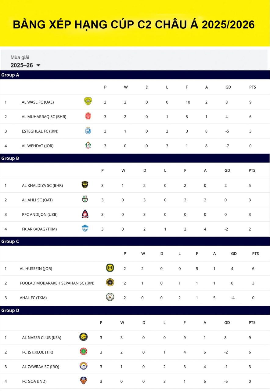 Bảng xếp hạng cúp C2 châu Á mới nhất: Nam Định giữ nguyên vị trí