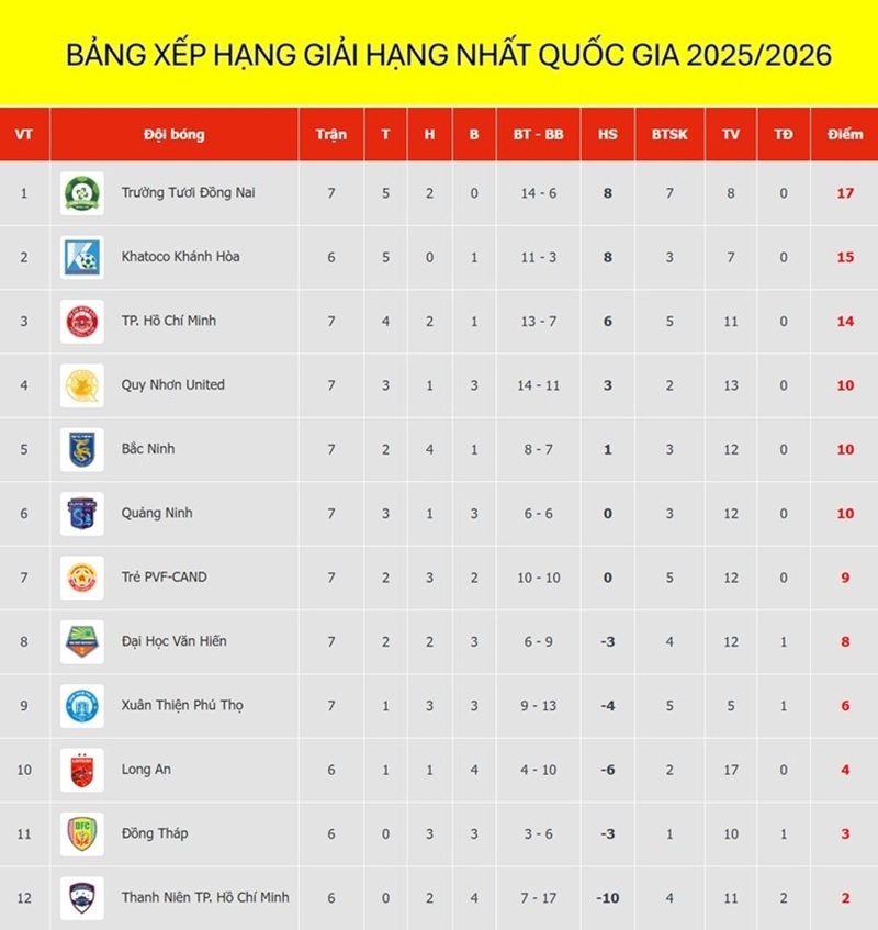 VOV.VN - Bảng xếp hạng giải hạng Nhất Quốc gia 2025/2026 mới nhất, CLB Đồng Nai trở lại vị trí dẫn đầu mà chưa cần đến sự phục vụ của Công Phượng.