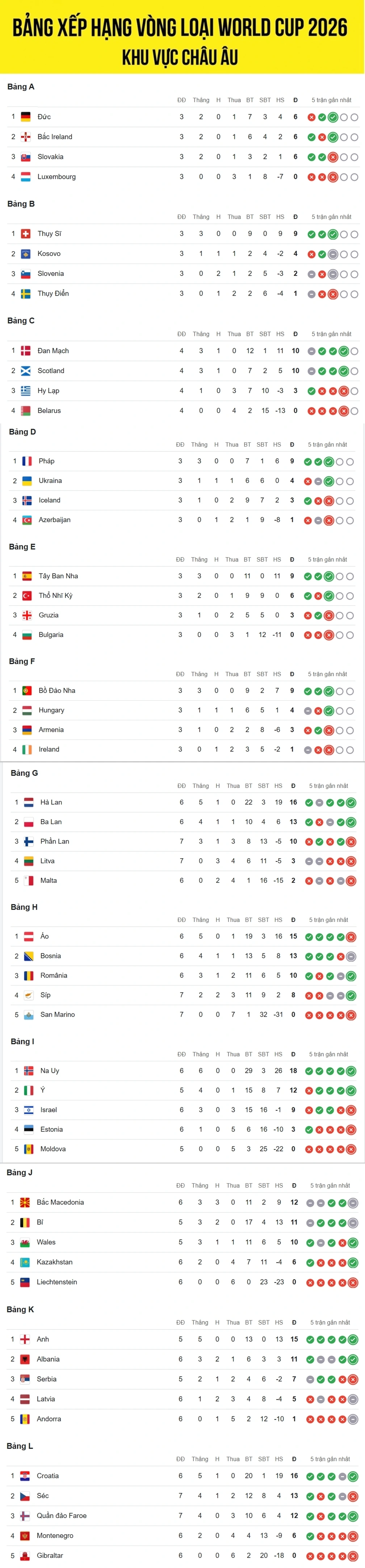 Từ khóa: World Cup, World Cup, World Cup 2026, vòng loại World Cup 2026, bảng xếp hạng vòng loại World Cup 2026,Bảng xếp hạng vòng loại World Cup 2026 khu vực châu Âu mới nhất