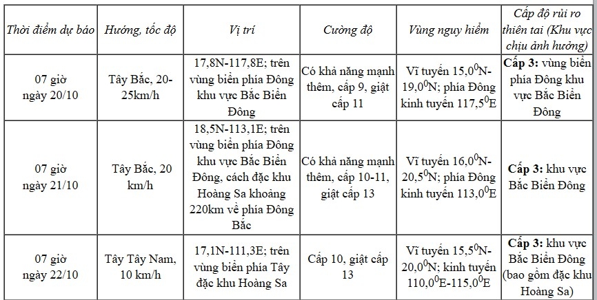 Cảnh báo, trong khoảng ngày 20-22/10, khu vực Bắc Biển Đông (bao gồm đặc khu Hoàng Sa) có khả năng chịu tác động của gió mạnh cấp 10-11, giật cấp 13.