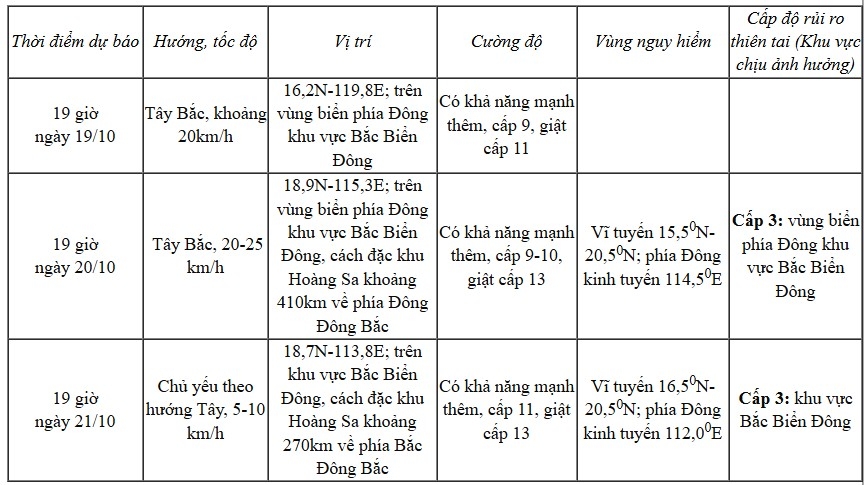 Cảnh báo, trong khoảng ngày 20-22/10, khu vực Bắc Biển Đông (bao gồm đặc khu Hoàng Sa) có khả năng chịu tác động của gió mạnh cấp 10-11, giật cấp 13. Toàn bộ tàu thuyền hoạt động trong vùng nguy hiểm có khả năng chịu ảnh hưởng của dông, lốc, gió mạnh và sóng lớn.