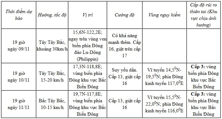 Trong khoảng ngày 10-12/11, vùng biển phía Đông khu vực Bắc Biển Đông có khả năng chịu tác động của gió bão mạnh cấp 11-13, giật cấp 16, sóng biển cao 8,0-10,0m. Biển động dữ dội.