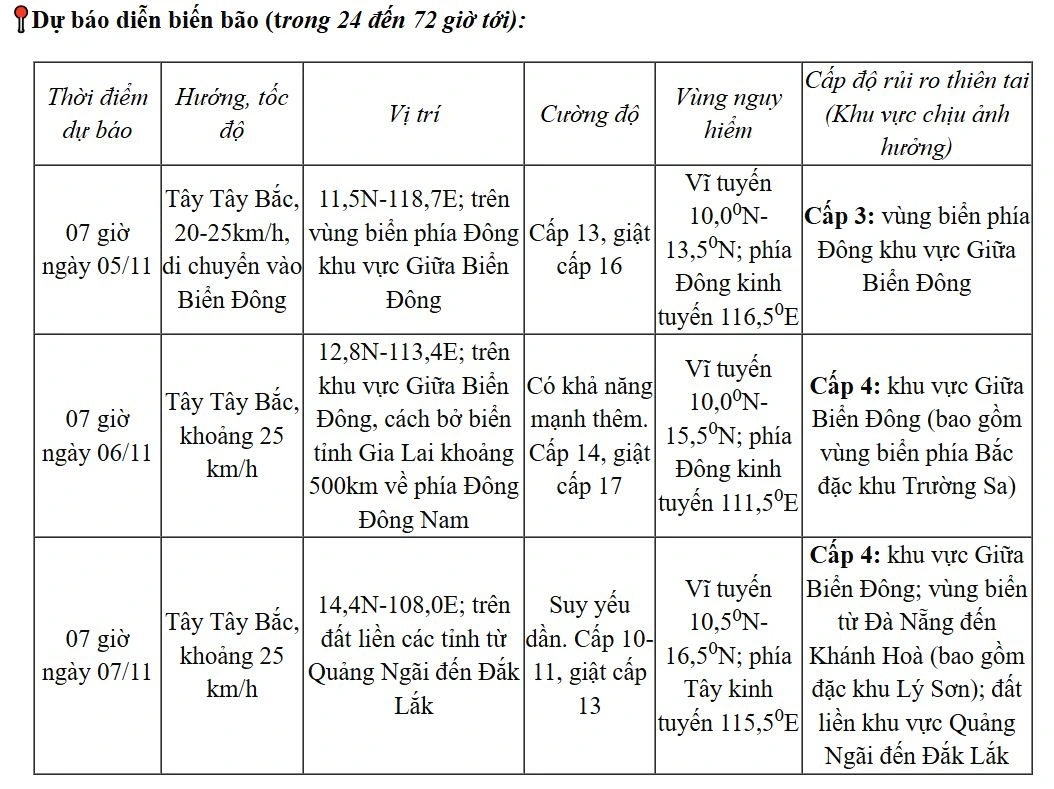 Từ chiều 4/11, vùng biển phía Đông khu vực giữa Biển Đông có gió mạnh dần lên cấp 6-7, sau tăng lên cấp 8-10; vùng gần tâm bão mạnh cấp 11-13, giật cấp 15-16. Sóng biển cao 5-7 m, Biển Đông dự báo động dữ dội.