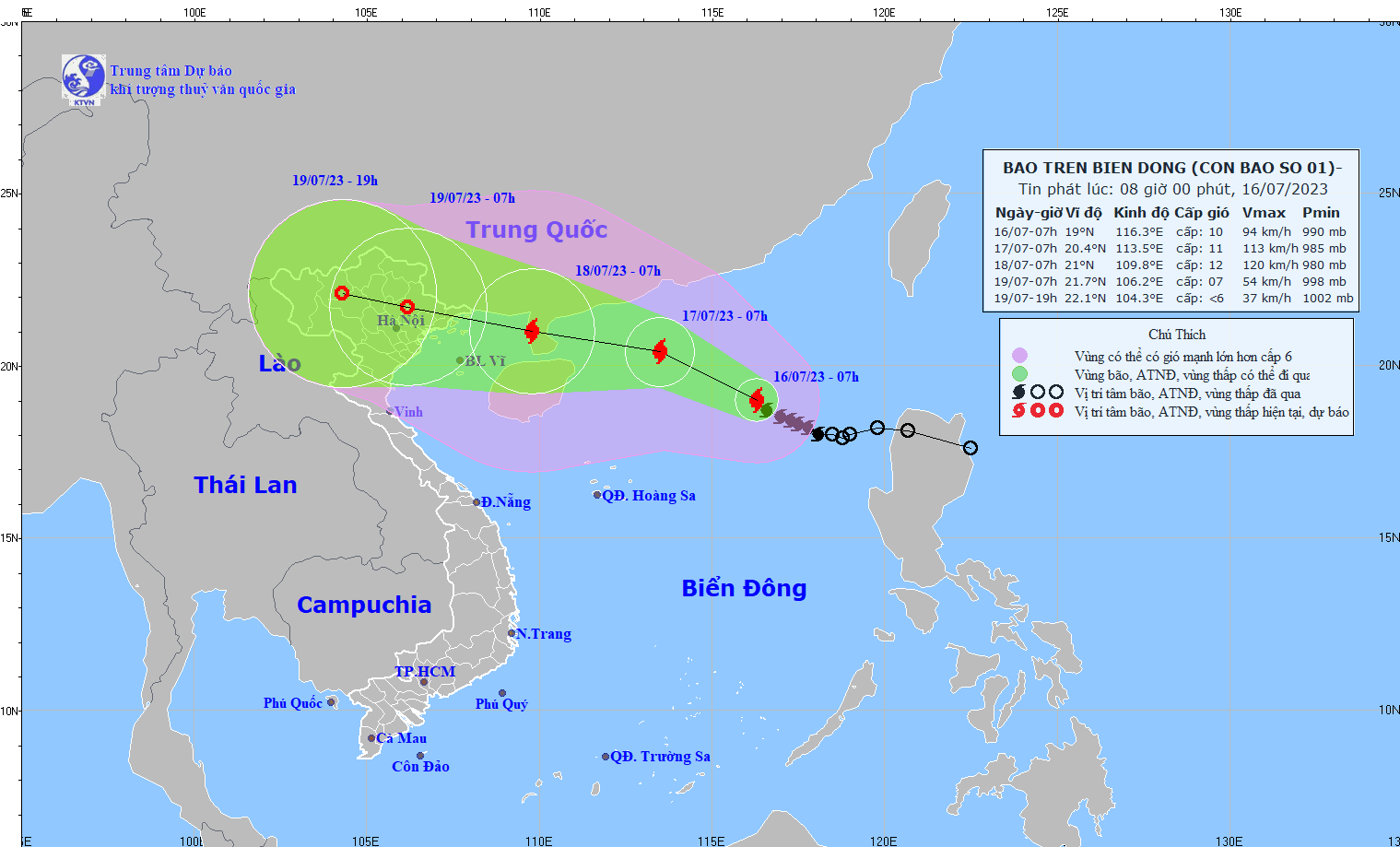 VOV.VN - Hồi 7h ngày 16/7, vị trí tâm bão số 1 ở vào khoảng 19,0 độ Vĩ Bắc; 116,3 độ Kinh Đông, cách bán đảo Lôi Châu (Trung Quốc) khoảng 670km về phía Đông Đông Nam.