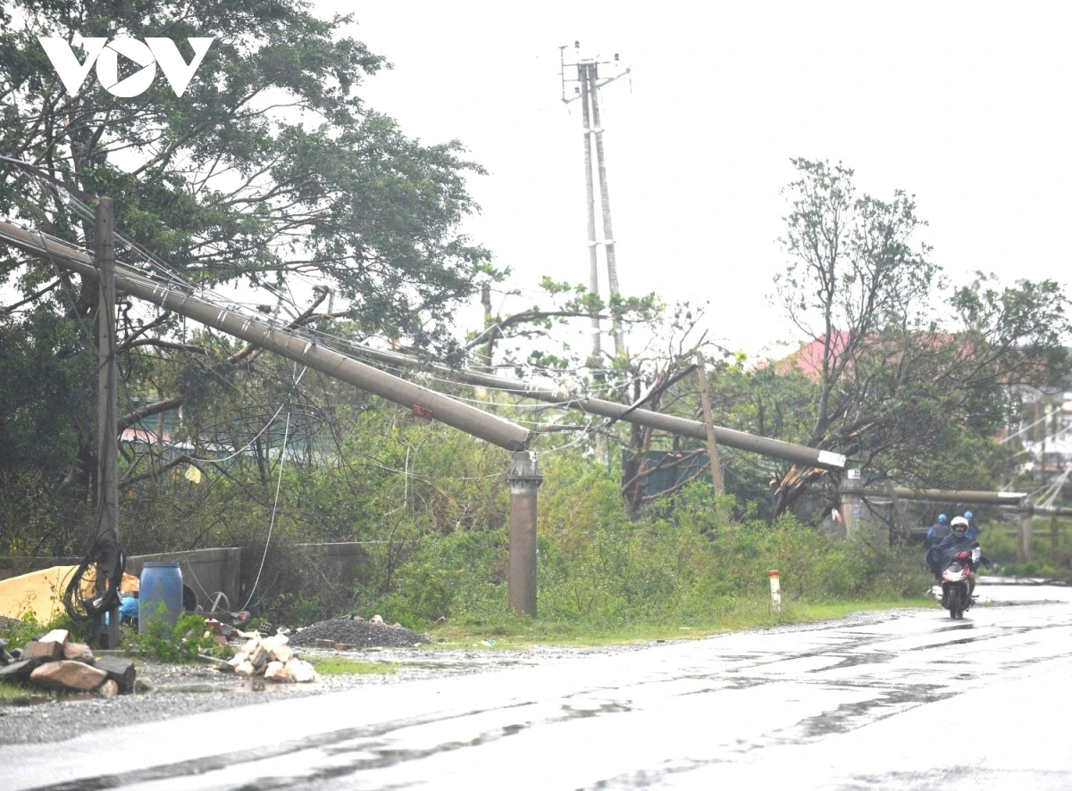 VOV.VN - Bão số 10 kèm theo mưa to, gió giật mạnh làm hệ thống điện tại tỉnh Quảng Trị bị sự cố khá nghiêm trọng. Hàng trăm cột điện bị gãy đổ, nhiều đường dây điện bị đứt, vỡ sứ làm gián đoạn việc cung cấp điện phục vụ sinh hoạt, sản xuất, kinh doanh của người dân.