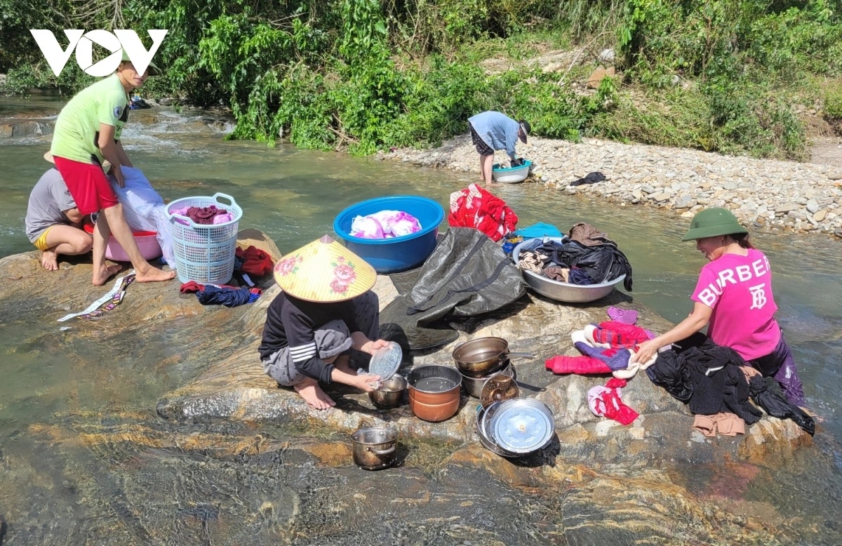 Bão số 10 làm mất điện diện rộng, người dân ra suối tắm giặt, gánh nước về dùng