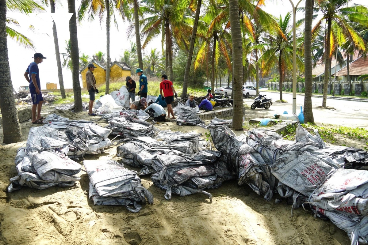 Chính quyền phường Hội An Đông đã huy động lực lượng, phương tiện và hỗ trợ các doanh nghiệp trên địa bàn tiếp tục sử dụng bao tải đựng cát và đóng cọc kè tạm bảo vệ bờ biển Cửa Đại trước khi bão số 13 đổ bộ.
