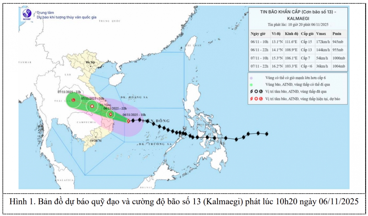 VOV.VN -Theo Trung tâm Dự báo Khí tượng Thủy văn Quốc gia, sáng 6/11, bão số 13 (tên quốc tế Kalmaegi) đang tiến nhanh vào khu vực đất liền các tỉnh từ Quảng Trị đến Khánh Hòa. Đây là cơn bão có cường độ rất mạnh, phạm vi ảnh hưởng rộng, gây gió giật dữ dội, sóng cao và mưa lớn trên diện rộng.