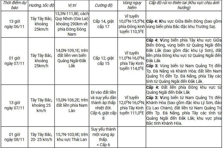 Từ gần sáng 6/11, vùng biển từ Nam Quảng Trị đến Khánh Hòa (bao gồm khu vực Lý Sơn, Cù Lao Chàm) gió mạnh dần lên cấp 6-7, sau tăng lên cấp 8-11, vùng gần tâm bão cấp 12-14, giật cấp 17; sóng biển cao 3-5 m, vùng gần tâm bão 6-8 m, biển động dữ dội.