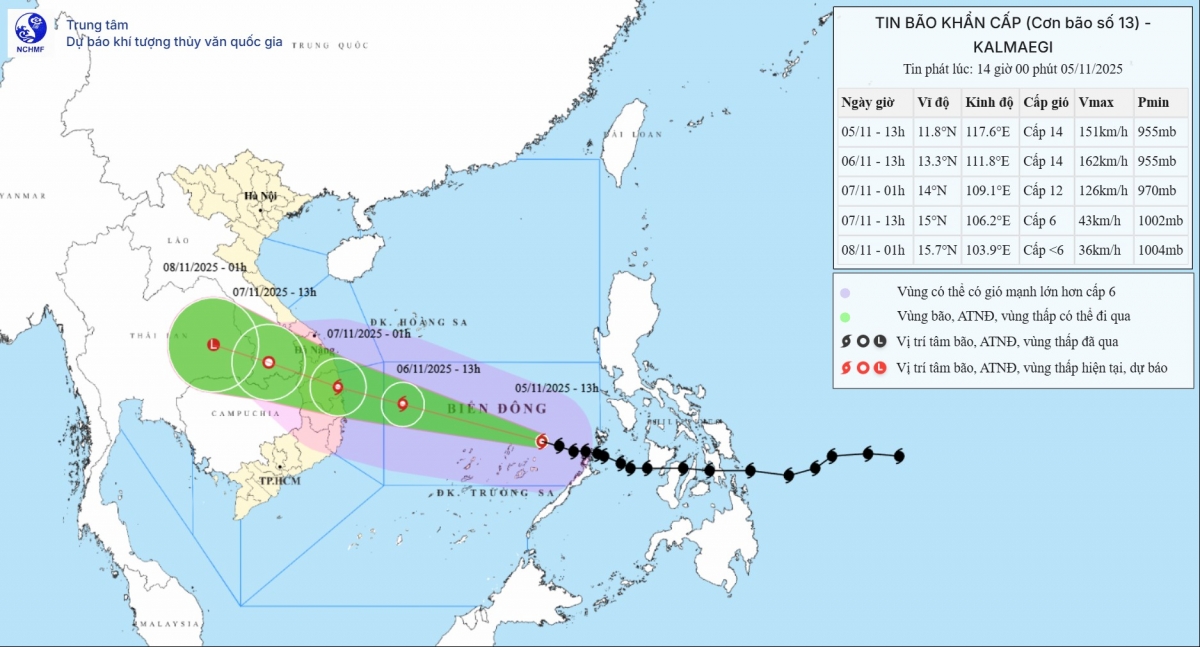 Hiện trạng bão: Hồi 13h ngày 5/11, tâm bão Kalmaegi ở khoảng 11,8 độ Vĩ Bắc; 117,6 độ Kinh Đông, cách đảo Song Tử Tây khoảng 360 km về phía Đông.