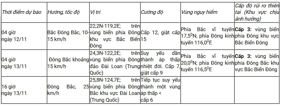 Hồi 4 giờ hôm nay 11/11, vị trí tâm bão ở vào khoảng 19,3 độ Vĩ Bắc; 118,1 độ Kinh Đông, trên vùng biển phía Đông khu vực Bắc Biển Đông. Sức gió mạnh nhất vùng gần tâm bão mạnh cấp 12 (118-133km/giờ), giật cấp 15. Di chuyển theo hướng Bắc Tây Bắc, tốc độ khoảng 10km/h.