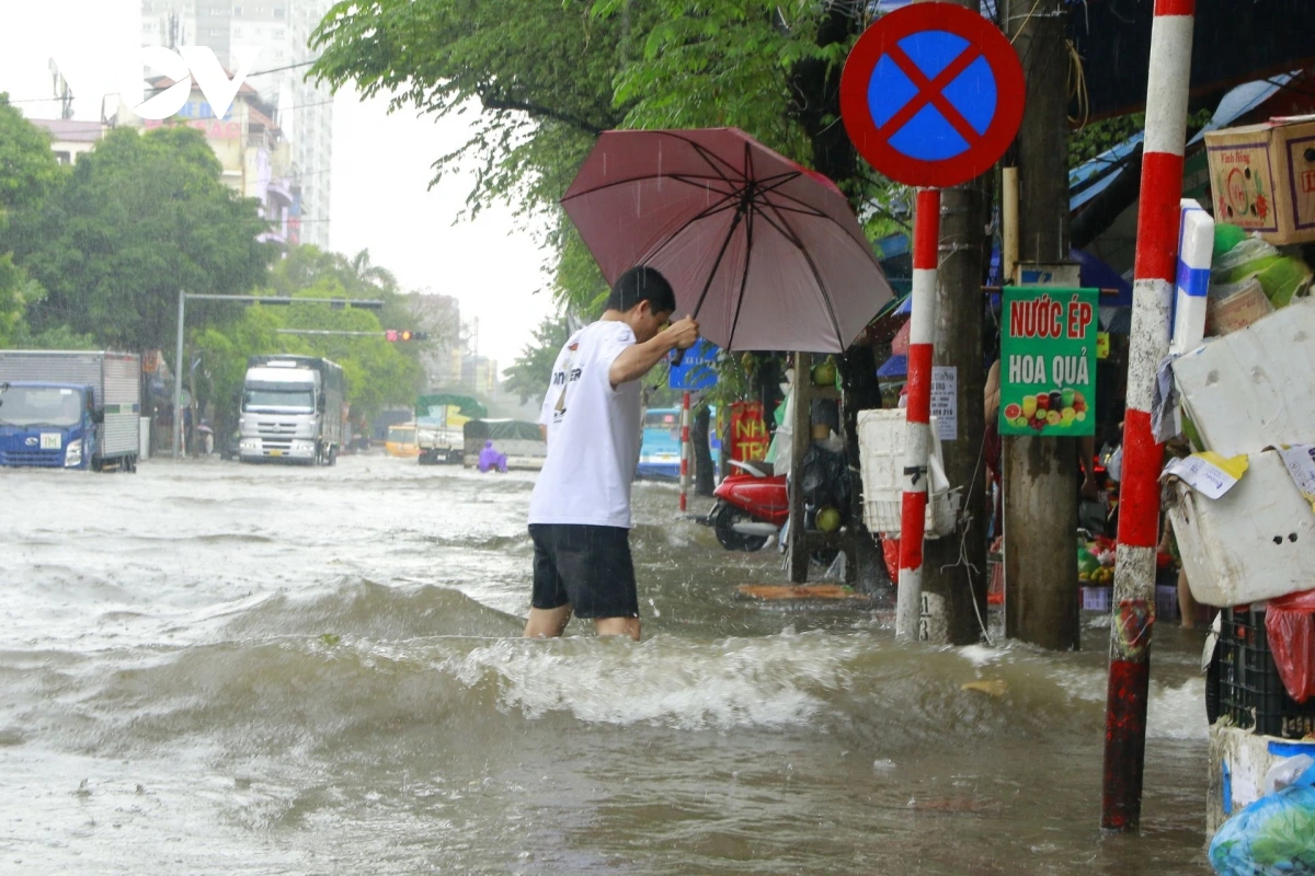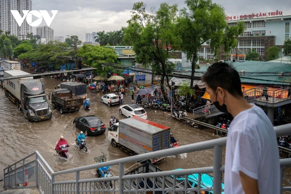 Theo ghi nhận của phóng viên Báo Điện tử Tiếng nói Việt Nam, sáng 1/10, khi nhiều tuyến phố Hà Nội còn ngập sâu sau trận mưa lớn kéo dài từ ngày 30/9, cổng Bệnh viện K Tân Triều (Thanh Trì, Hà Nội) vẫn là điểm nóng ngập úng.