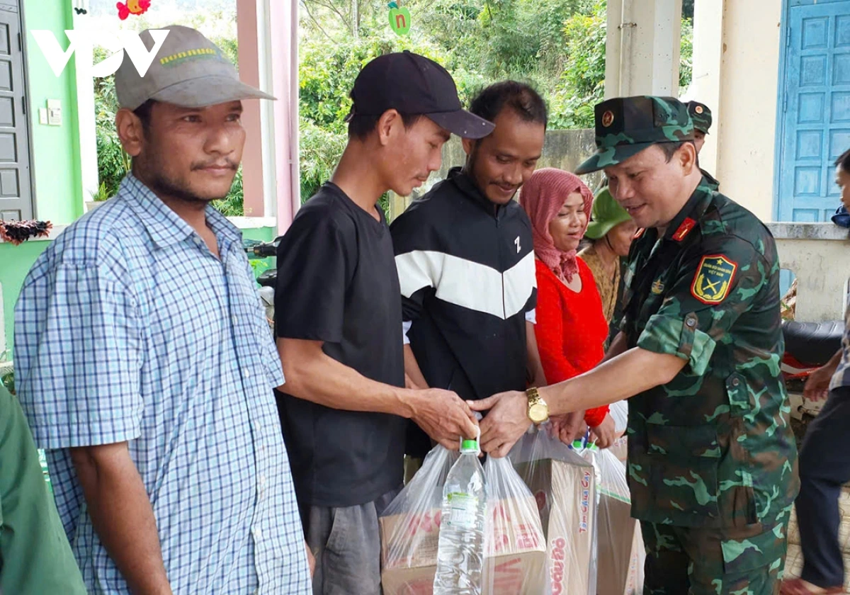 Đoàn cũng trao quà của Quân khu 5 gồm 500 kg lương khô và 4 tấn gạo của Bộ Chỉ huy Quân sự thành phố đến hỗ trợ đồng bào vùng bị cô lập.