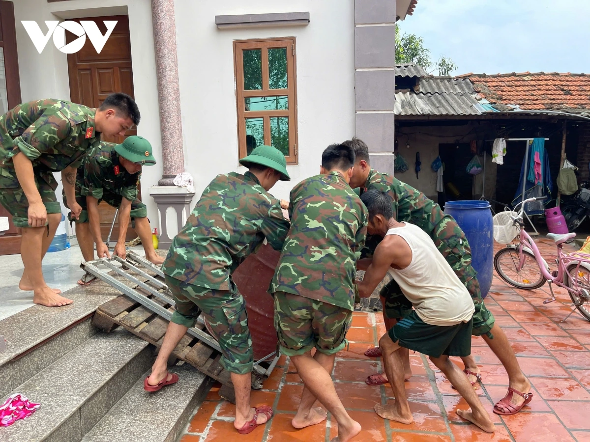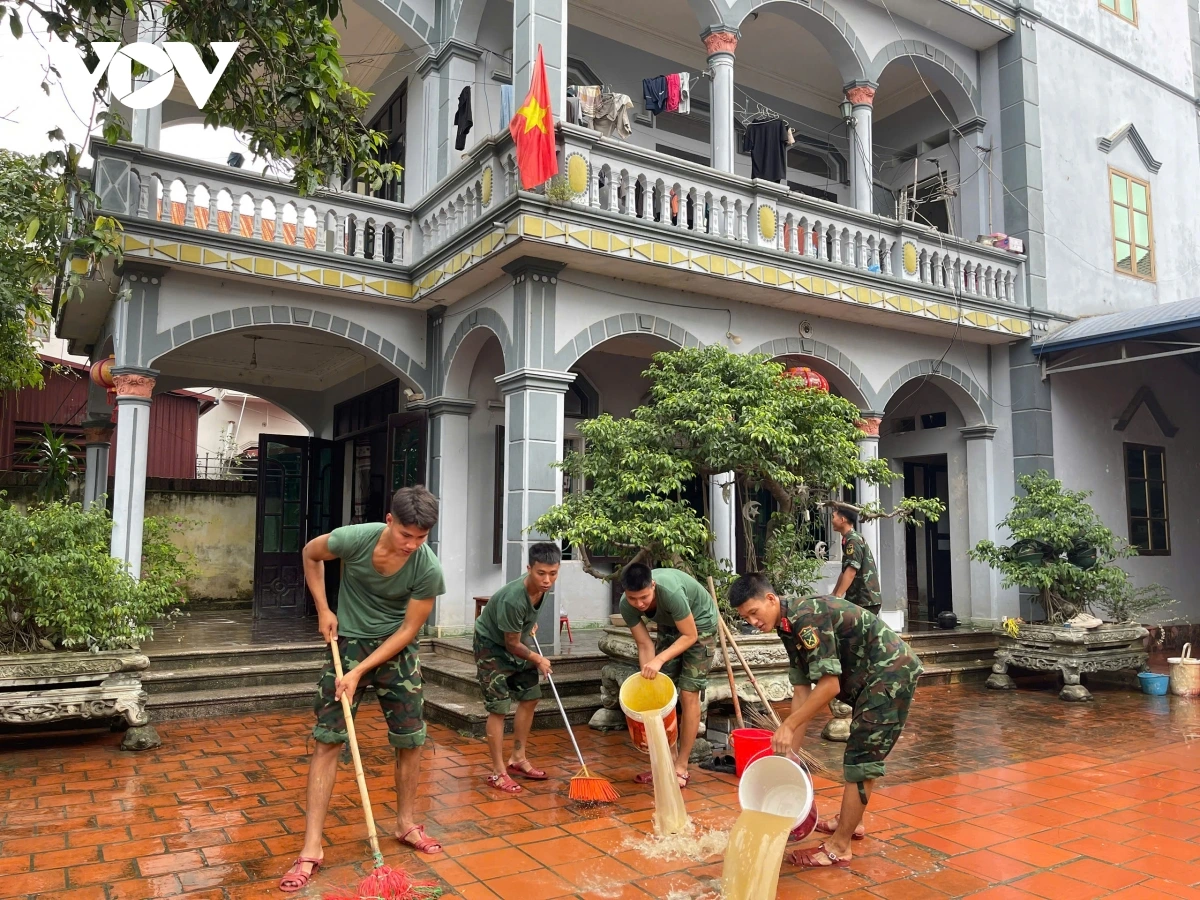 Trước sân nhà bà Đỗ Thị Hạnh, thôn Trung Kiên, xã Trung Giã, các chiến sĩ bộ đội đang chung tay giúp gia đình kê lại những chum, hũ đựng sản phẩm truyền thống của gia đình và dọn dẹp vệ sinh sau lũ.