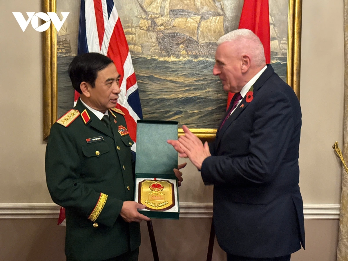 VOV.VN - Nhân dịp tháp tùng Tổng Bí thư Tô Lâm và Phu nhân thăm chính thức Vương quốc Liên hiệp Anh và Bắc Ireland, tối 28/10, Đại tướng Phan Văn Giang, Ủy viên Bộ Chính trị, Phó Bí thư Quân ủy Trung ương, Bộ trưởng Bộ Quốc phòng đã gặp song phương với ngài Vernon Coaker, Quốc vụ khanh Quốc phòng Vương quốc Liên hiệp Anh và Bắc Ireland.