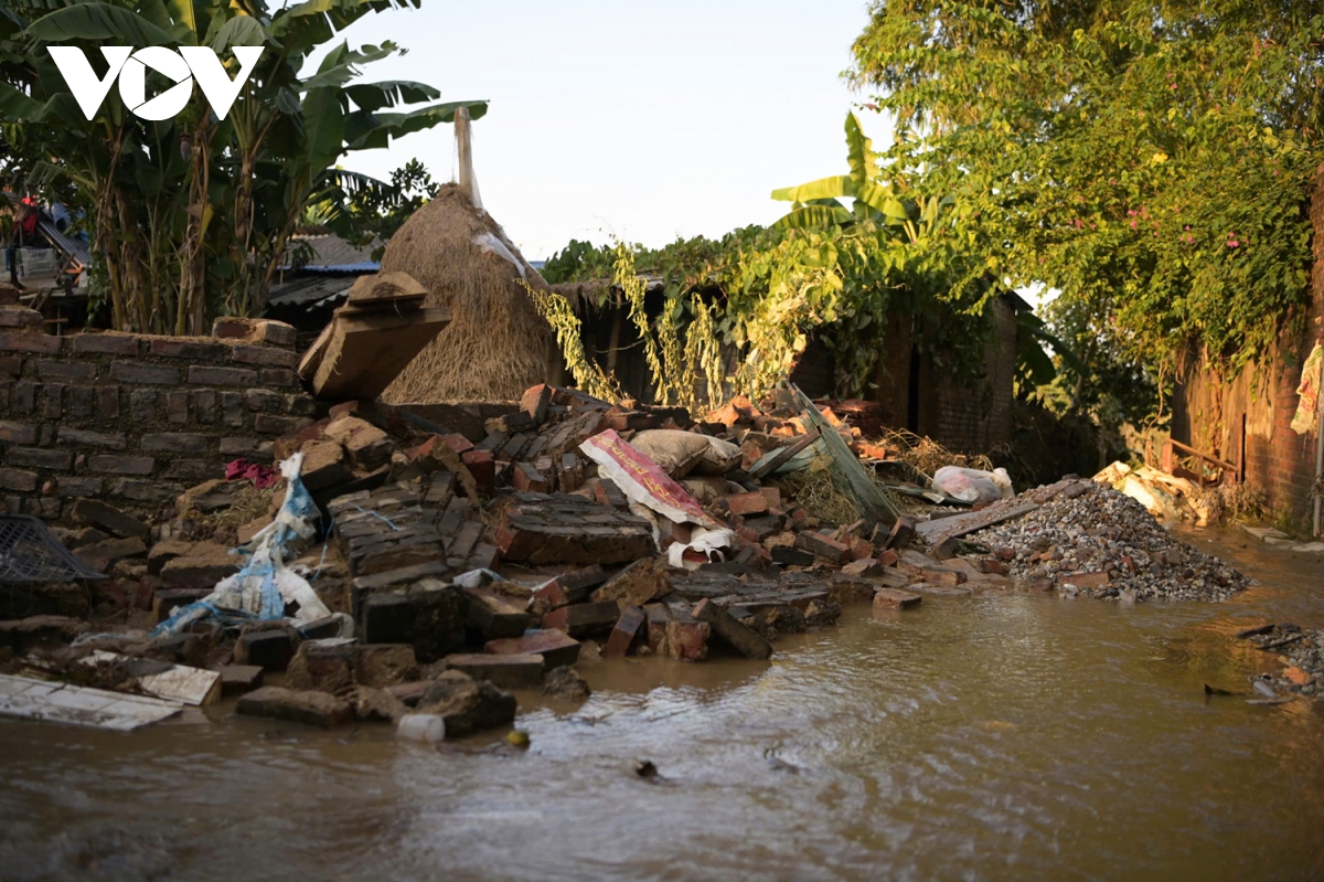 Những bức tường bao quanh khu phụ trong nhà cũng đã bị cơn lũ tàn phá, chỉ còn lại những đống gạch đổ nát.