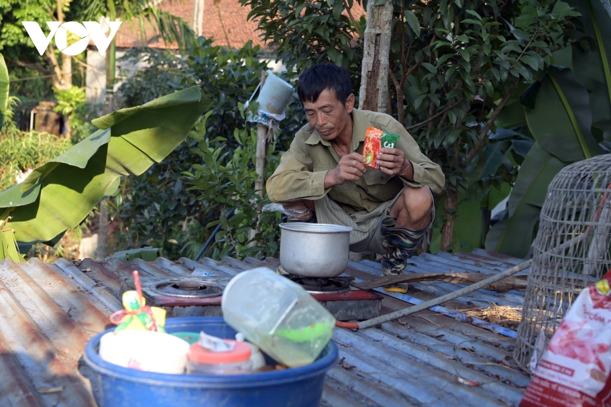 Ông Dương Văn Thiêm, 60 tuổi cùng gia đình sống trên mái tôn của khu chuồng lợn.