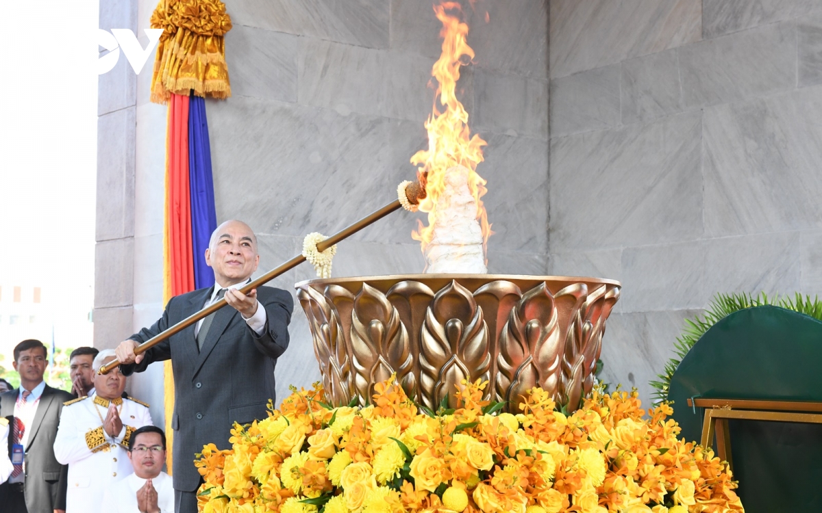 Như thông lệ hằng năm, sau lễ chào cờ, Quốc vương Norodom Sihamoni đã đặt vòng hoa tưởng nhớ các anh hùng, liệt sĩ, thắp ngọn đuốc trên Đài Độc lập ở trung tâm thủ đô Phnom Penh, biểu tượng cho chiến thắng, hòa bình và nền độc lập trọn vẹn của đất nước Campuchia. Quốc vương cũng thực hiện nghi thức duyệt đội ngũ, chúc mừng các lực lượng thuộc Quân đội Hoàng gia Campuchia, chào mừng các đại biểu và đông đảo các tầng lớp nhân dân Campuchia và bạn bè quốc tế tham dự lễ kỷ niệm trọng thể này.