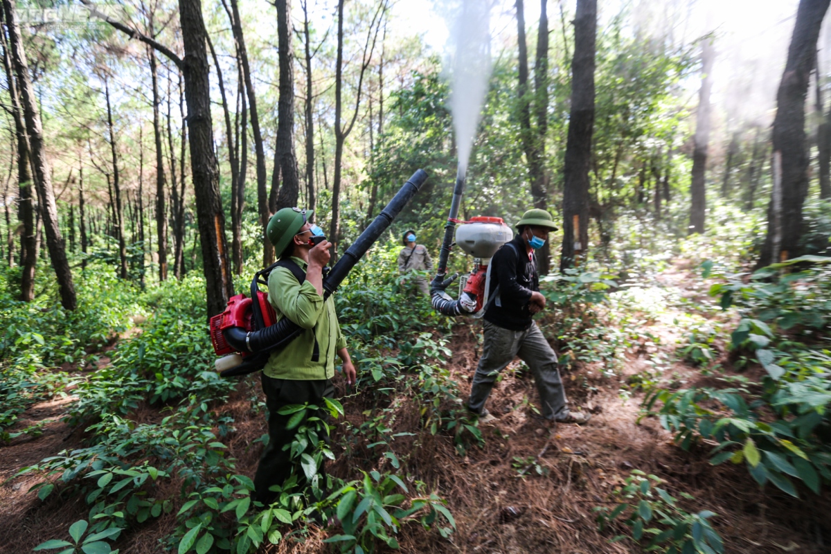 Các cán bộ ban quản lý rừng phòng hộ tăng cường kiểm tra những khu vực đang lan rộng dịch sâu róm.