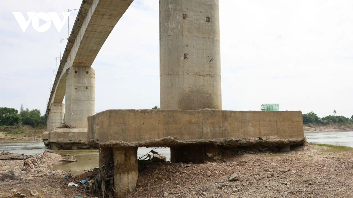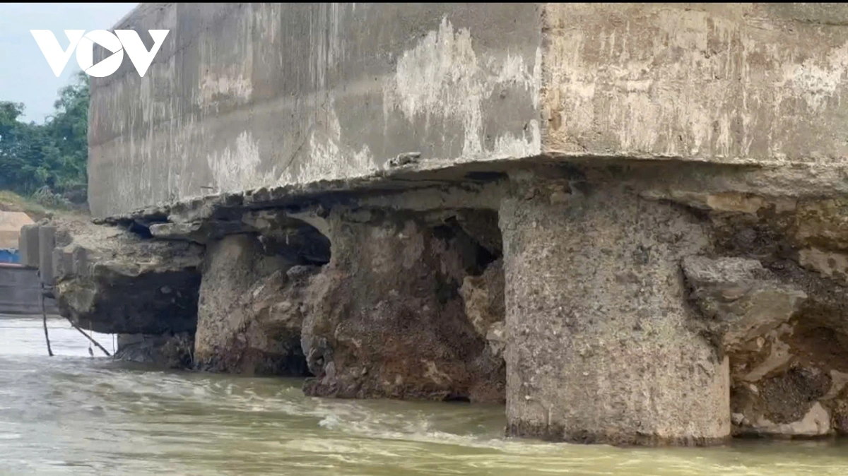 Trụ cầu sông Lô đang rỗng phần móng, để lộ lớp cốt thép han gỉ bên trong.