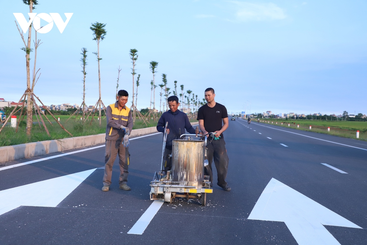 Trên tuyến đường Nam Định - Lạc Quần, công nhân đang hoàn thiện hạng mục sơn kẻ phân làn, đảm bảo an toàn và mỹ quan cho toàn tuyến.