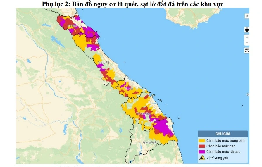 Tại Huế, các xã/phường có nguy cơ xảy ra lũ quét trên các sông, suối nhỏ, sạt lở đất trên sườn dốc, bao gồm: Bình Điền, P. Phong Điền; A Lưới 2, A Lưới 3, A Lưới 4, Khe Tre, Nam Đông; A Lưới 1, A Lưới 5, Chân Mây - Lăng Cô, Hưng Lộc, Lộc An, Long Quảng, P. Hương Trà, P. Phong Thái, P. Phú Bài, Phú Lộc.
