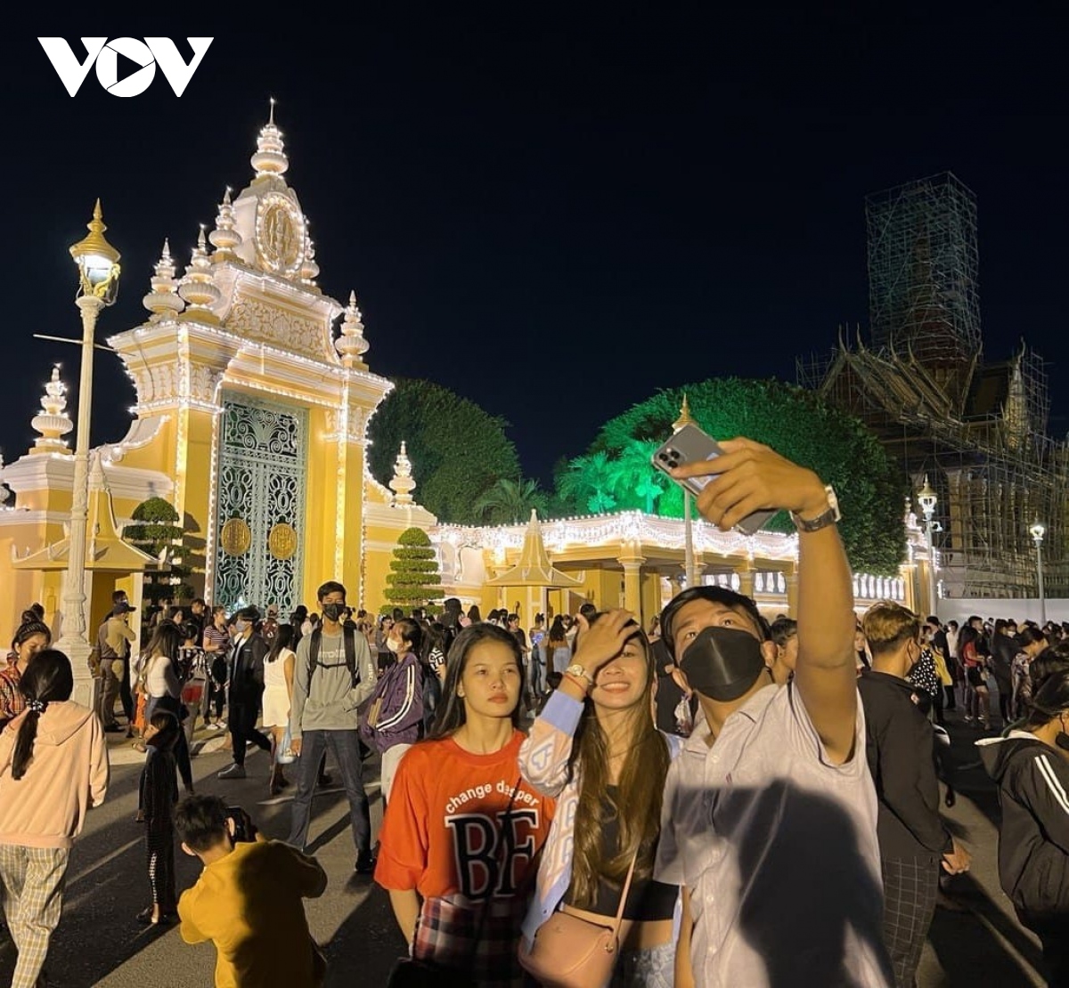PV Văn Đỗ, Phùng Kiên/VOV-Phnom Penh: Gần tới thời khắc giao thừa, mọi người đều hướng về phía sân khấu để sẵn sàng cùng nhau đếm ngược. Cũng có rất nhiều bạn trẻ muốn lưu lại thời khắc chuyển giao giữa năm cũ và chuẩn bị bước sang năm mới.