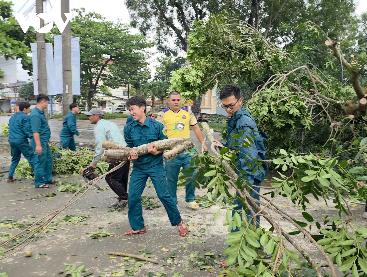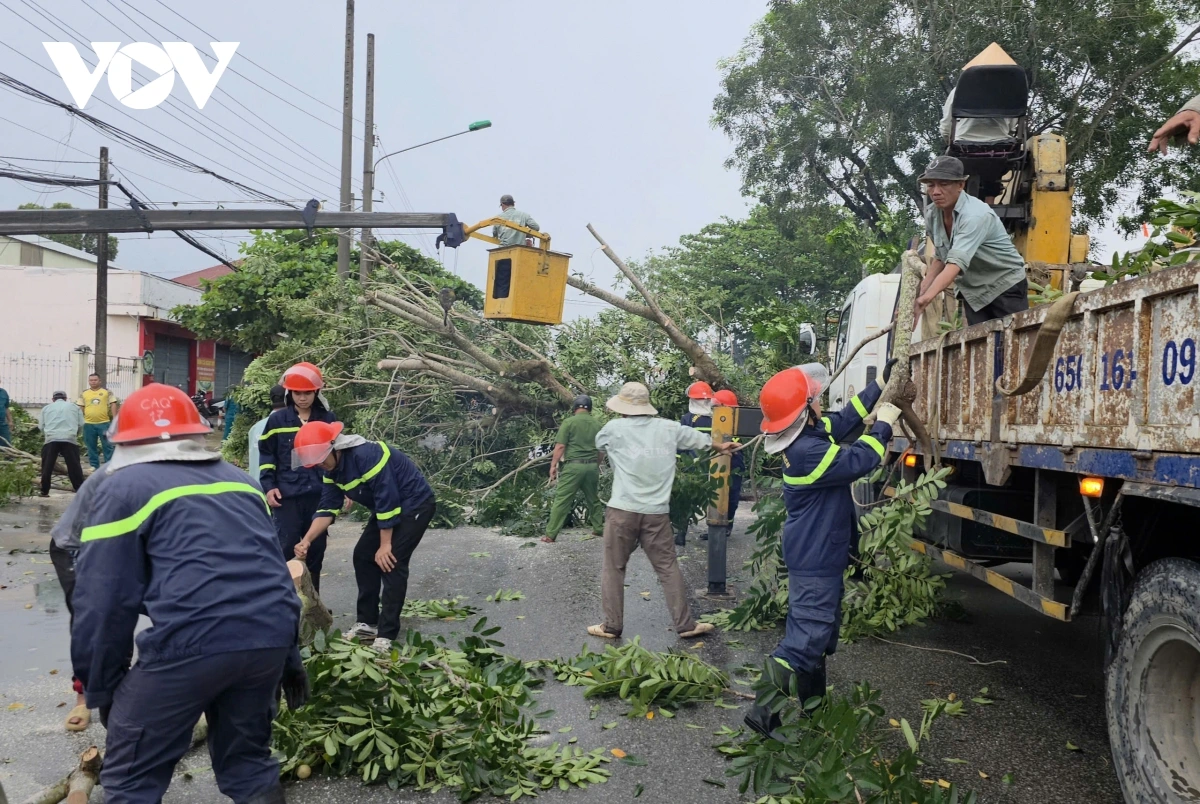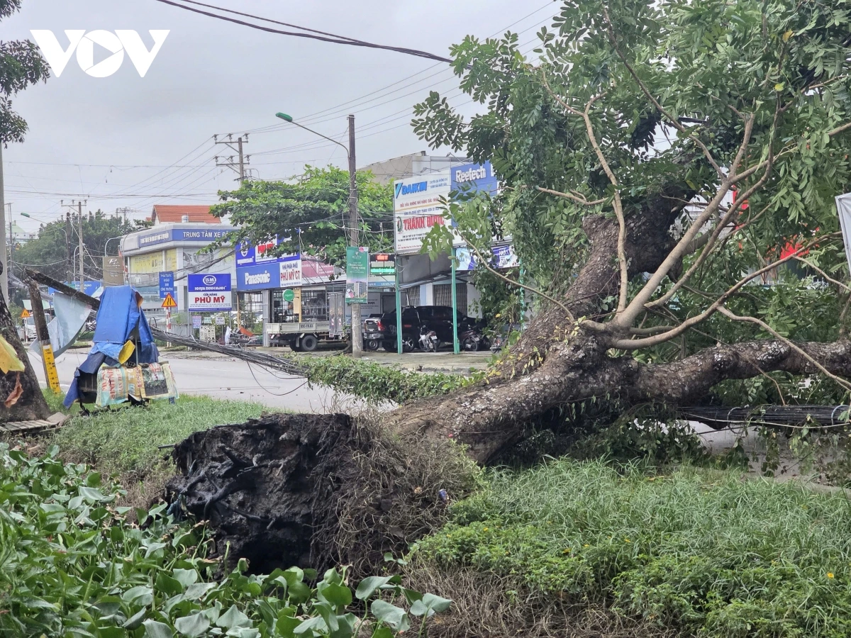 Cây xà cừ đổ ra đường khiến giao thông đi lại khó khăn. Hai trụ dây cáp gần đó bị gãy, hệ thống dây điện trung thế bị kéo trùng, dẫn đến mất điện cục bộ trong khu vực.