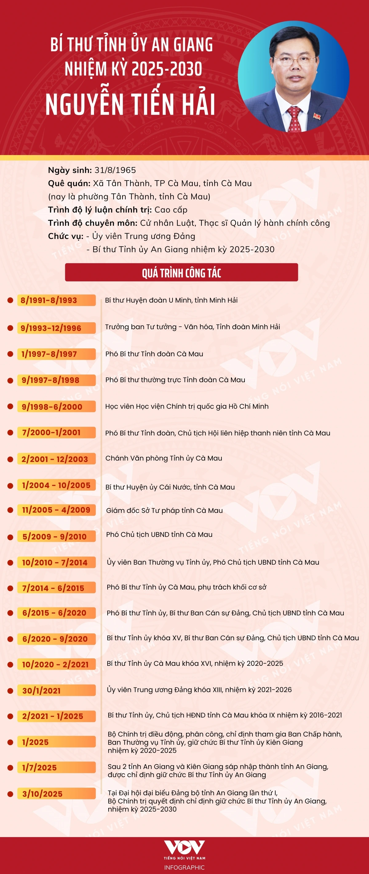 VOV.VN - Ngày 3/10, tại Đại hội đại biểu Đảng bộ tỉnh An Giang khóa I, nhiệm kỳ 2025 - 2030, ông Nguyễn Tiến Hải, Ủy viên Trung ương Đảng, Bí thư Tỉnh ủy An Giang được Bộ Chính trị chỉ định tiếp tục giữ chức Bí thư Tỉnh ủy nhiệm kỳ 2025 - 2030.