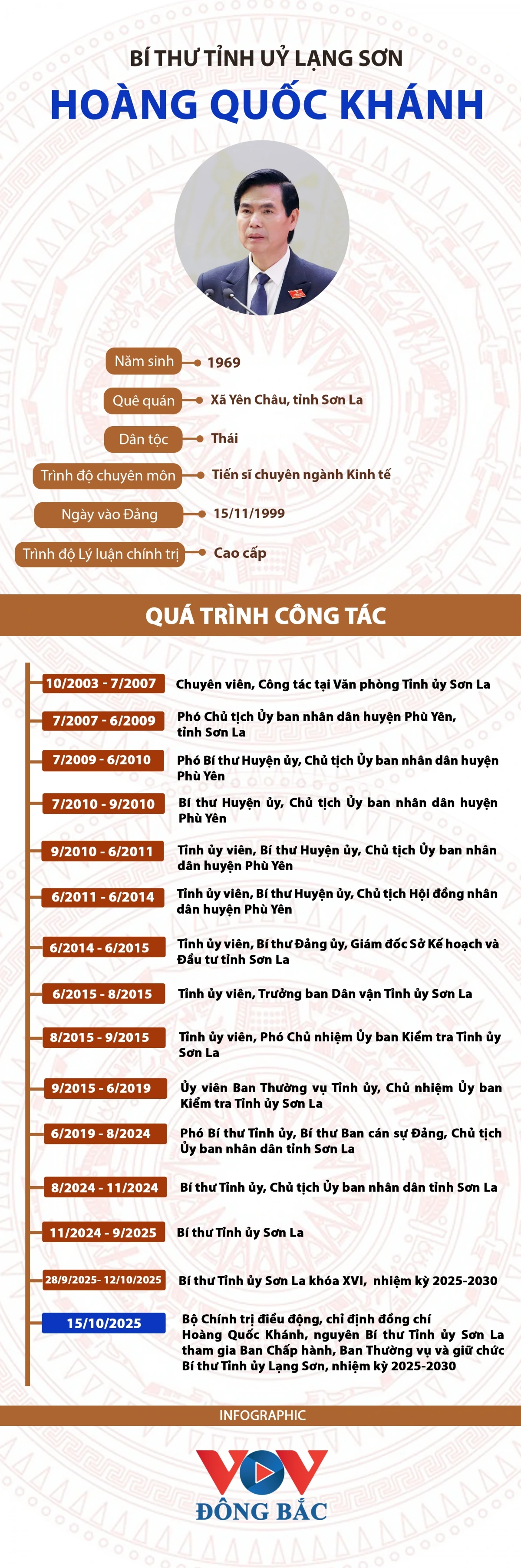 VOV.VN - Bộ Chính trị điều động, chỉ định ông Hoàng Quốc Khánh tham gia Ban Chấp hành, Ban Thường vụ và giữ chức Bí thư Tỉnh ủy Lạng Sơn, nhiệm kỳ 2025-2030 từ ngày 15/10/2025, thay cho ông Hoàng Văn Nghiệm được Bộ Chính trị điều động, chỉ định làm Bí thư Tỉnh ủy Sơn La.