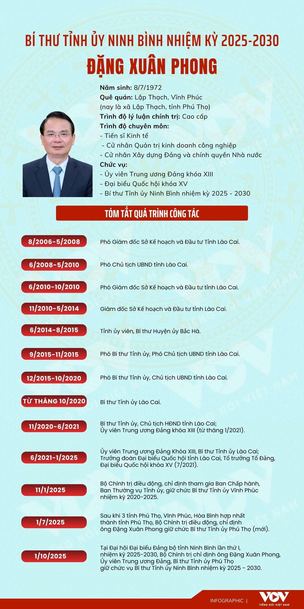 VOV.VN - Sáng 1/10, tại Đại hội Đại biểu Đảng bộ tỉnh Ninh Bình lần thứ I, nhiệm kỳ 2025-2030 đã công bố Quyết định của Bộ Chính trị về việc chỉ định ông Đặng Xuân Phong, Ủy viên Trung ương Đảng, Bí thư Tỉnh ủy Phú Thọ giữ chức vụ Bí thư Tỉnh ủy Ninh Bình nhiệm kỳ 2025-2030.