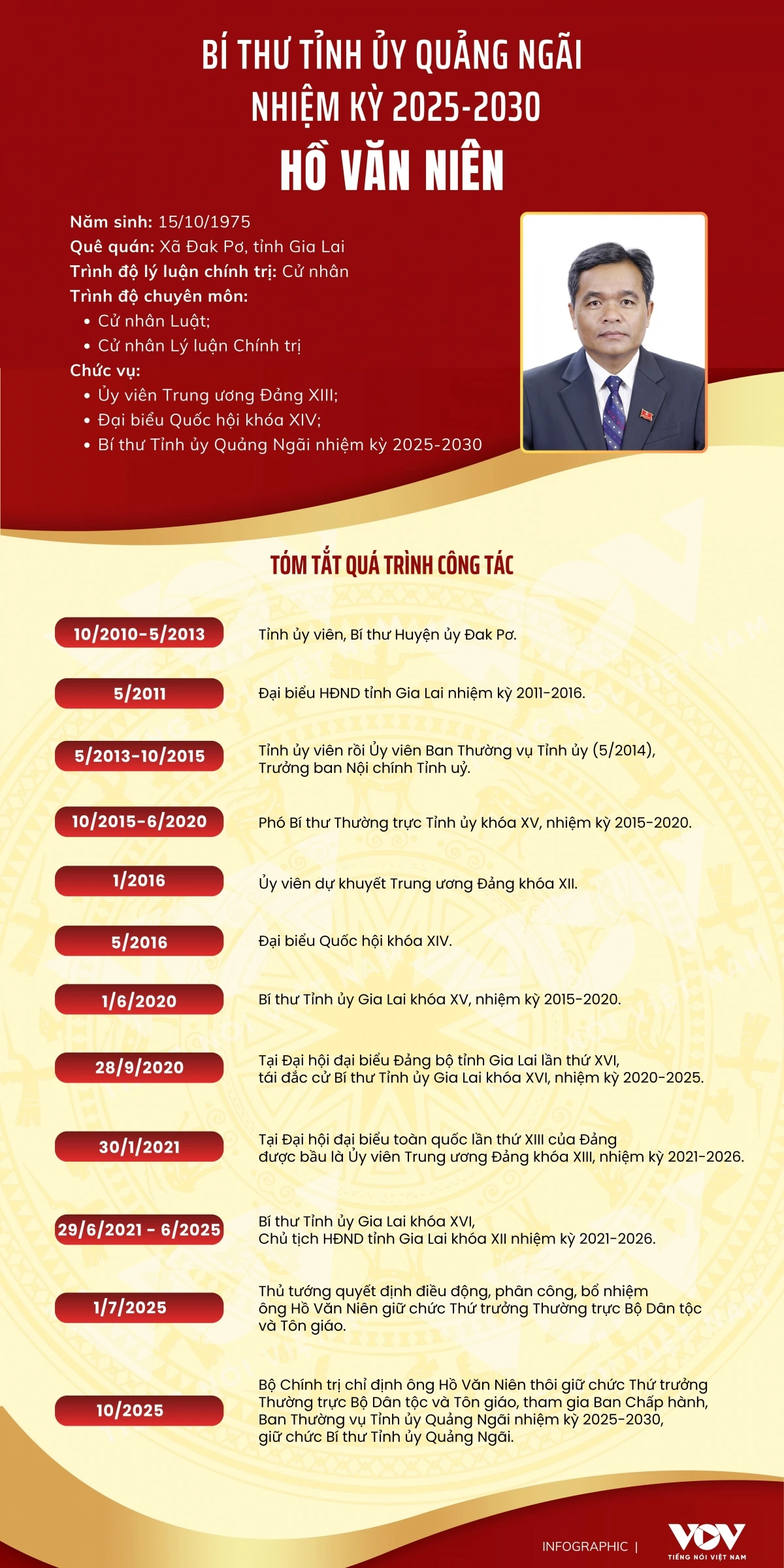 VOV.VN - Bộ Chính trị chỉ định ông Hồ Văn Niên thôi giữ chức Thứ trưởng Thường trực Bộ Dân tộc và Tôn giáo, tham gia Ban Chấp hành, Ban Thường vụ Tỉnh ủy Quảng Ngãi nhiệm kỳ 2025-2030, giữ chức Bí thư Tỉnh ủy Quảng Ngãi.