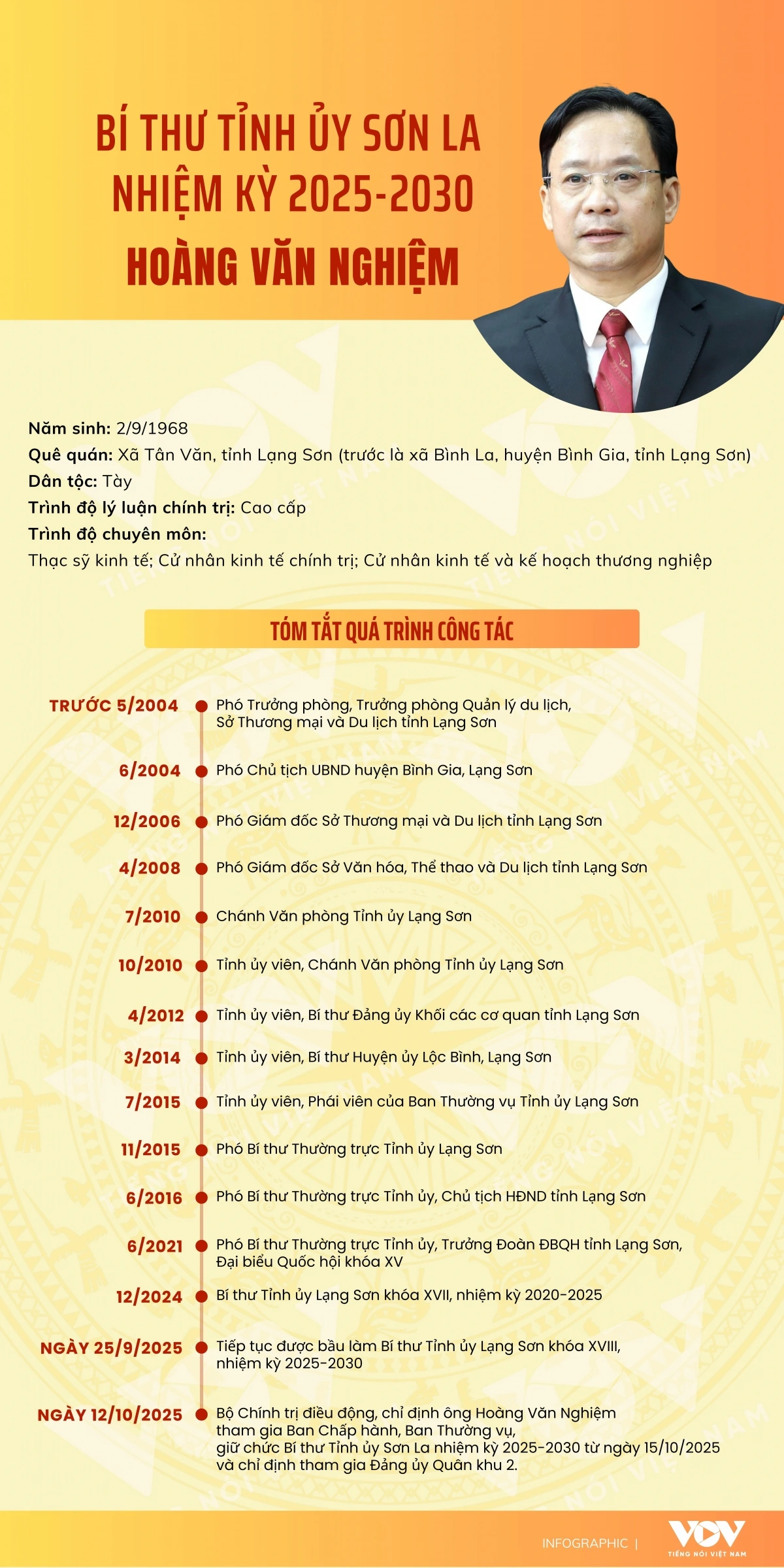 VOV.VN - Bộ Chính trị quyết định điều động, chỉ định ông Hoàng Văn Nghiệm, Bí thư Tỉnh ủy Lạng Sơn giữ chức Bí thư Tỉnh ủy Sơn La, nhiệm kỳ 2025-2030.