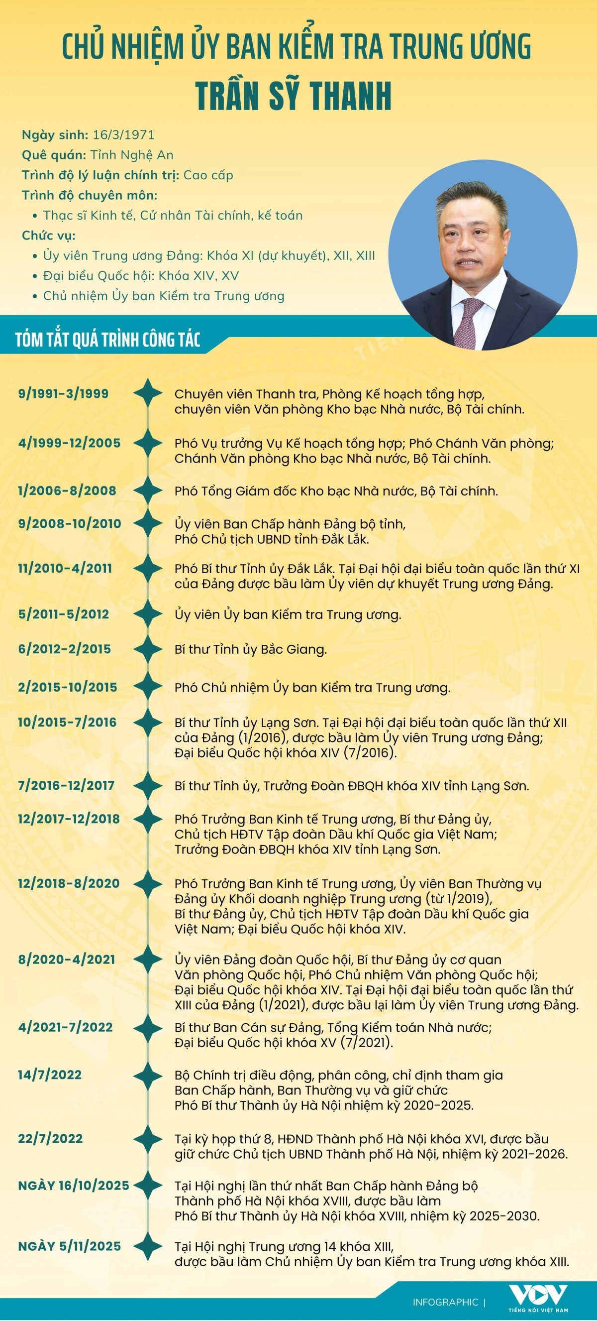 VOV.VN - Ngày 5/11, Tại Hội nghị Trung ương 14 khóa XIII, Trung ương bầu ông Trần Sỹ Thanh, Ủy viên Trung ương Đảng, Phó Bí thư Thành uỷ, Chủ tịch UBND thành phố Hà Nội tham gia Ủy ban Kiểm tra Trung ương và giữ chức Chủ nhiệm Ủy ban Kiểm tra Trung ương khoá XIII.