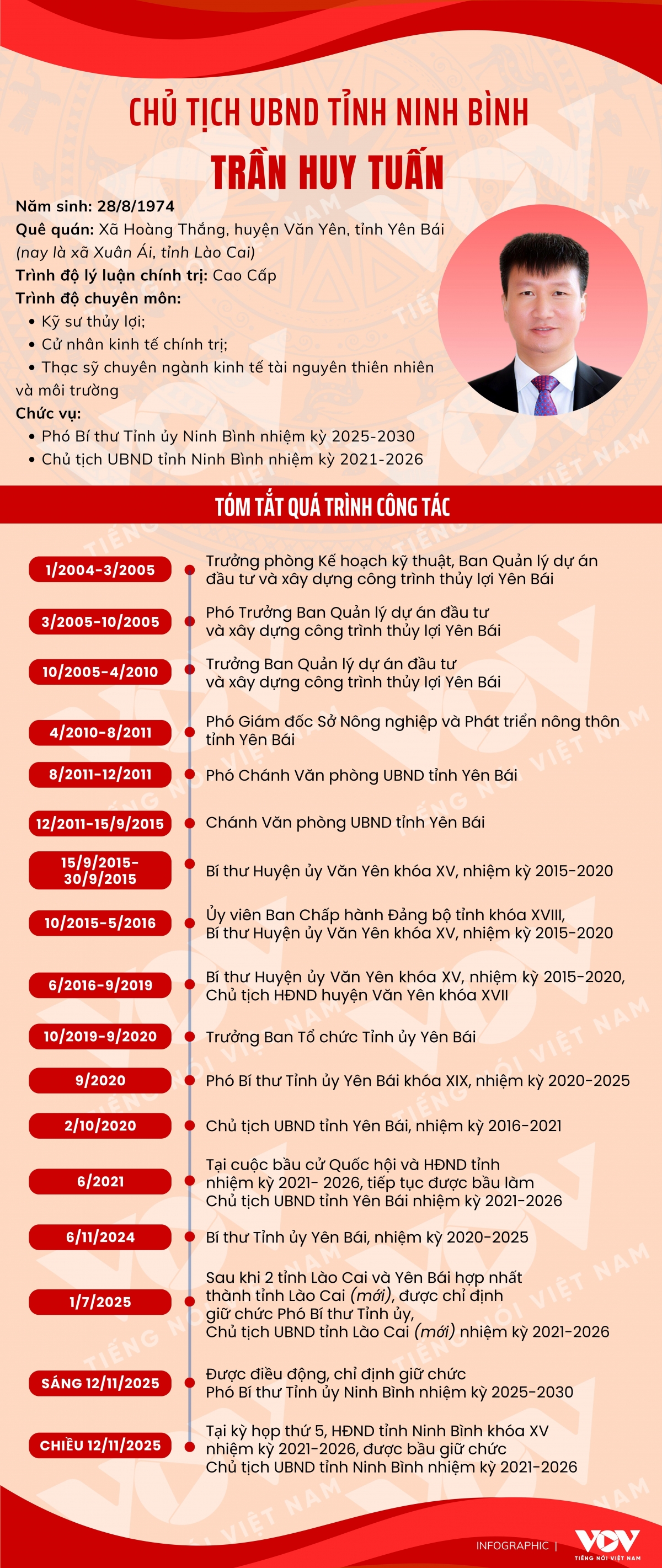 VOV.VN - HĐND tỉnh Ninh Bình khóa XV, nhiệm kỳ 2021-2026 tại kỳ họp chiều 12/11 đã bầu ông Trần Huy Tuấn, Phó Bí thư Tỉnh ủy Ninh Bình nhiệm kỳ 2025-2030 giữ chức Chủ tịch UBND tỉnh Ninh Bình, nhiệm kỳ 2021-2026.