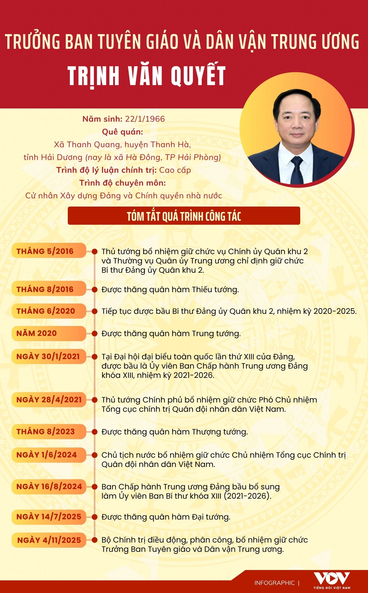 VOV.VN - Ông Trịnh Văn Quyết được Bộ Chính trị điều động, phân công, bổ nhiệm giữ chức Trưởng Ban Tuyên giáo và Dân vận Trung ương.