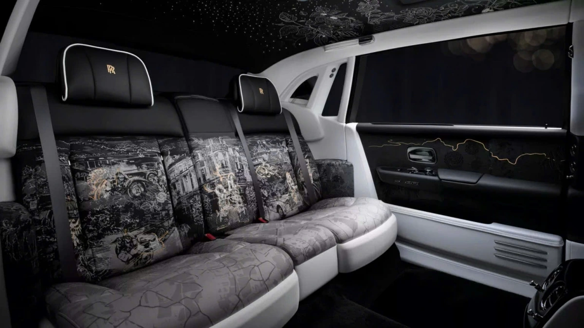 Bước vào khoang nội thất, người dùng được chào đón bằng bảng táp-lô “Gallery” độc quyền, nơi trưng bày tác phẩm nghệ thuật mang tên “Spirit of Legacy” được làm thủ công từ nhôm và bạc nguyên khối. Nội thất sử dụng da Grace White phối đen Obsidian, kết hợp chi tiết chỉ thêu bạc và huy hiệu “Phantom Centenary” được khắc laser trên tựa đầu. Phải mất hơn một năm để hoàn thành tác phẩm nghệ thuật này và nó chứa hơn 160.000 mũi khâu.