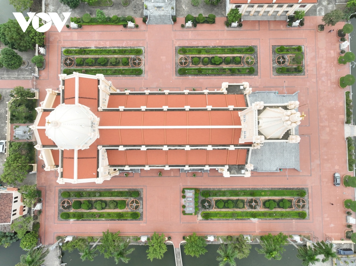 Hình ảnh bên hông phía sau Đền Thánh Báo Đáp nổi bật với điểm nhấn kiến trúc với mái vòm cong, họa tiết tinh tế và tường sơn màu ấm áp.
