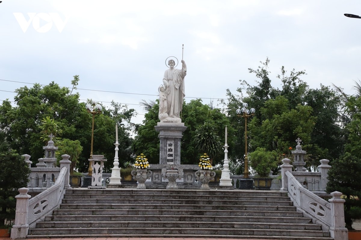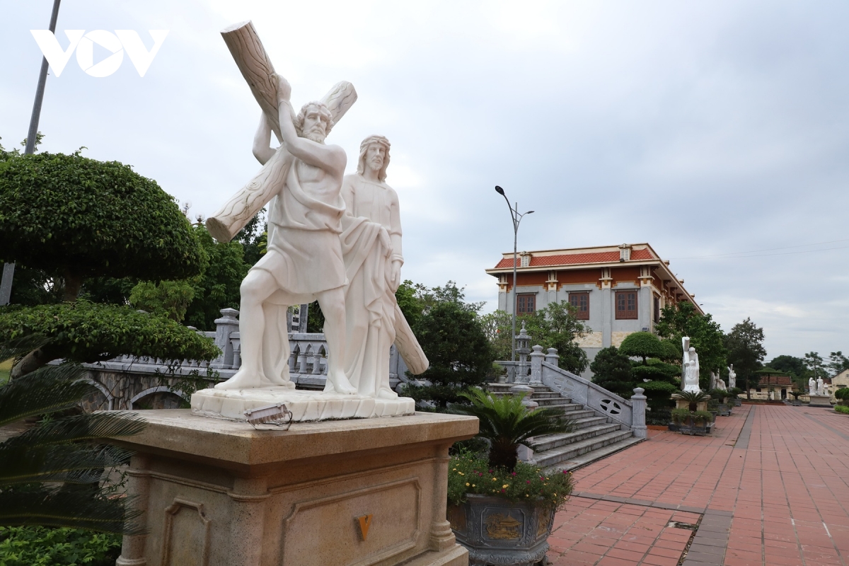 Tượng thánh được đặt hai bên, kết hợp với kiến trúc độc đáo, mở lối vào không gian linh thiêng.